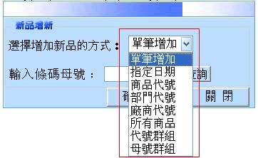 單擊“E增加新品”窗口中的黑三角,選擇“商品代號”方式,並在輸入框輸入起始和截止的商品代號。如圖: