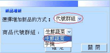 單擊“E增加新品”窗口中的黑三角,選擇“代號群組”方式,並在下拉菜單選擇您要的群組名稱。如圖: