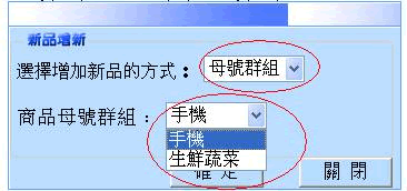 單擊“E增加新品”窗口中的黑三角,選擇“母號群組”方式,並在下拉菜單選擇您要的群組名稱。如圖: