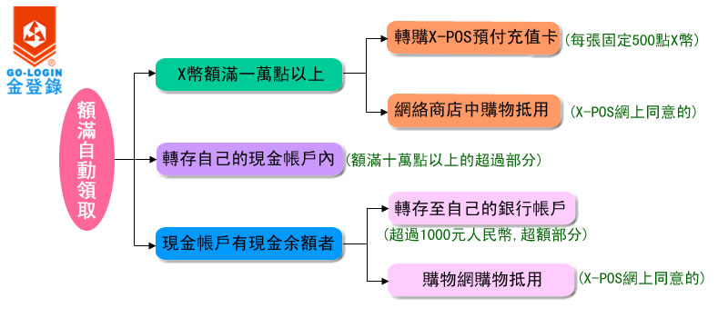 1.额满一万点以上的超过部分可以转购X-POS预付充值卡(每张固定500点X币)或可以使用X币在X-POS网上同意的网络商店中购物抵用。 2.额满十万点以上的超过部分可以指定转存自己的现金帐户内,(但是必须符合本公司规定成为店头代理商、代理商并办妥营业登记与本公司签署合法合约)。 3.现金帐户内存有现金余额者,金额超过1000元人民币者,可以手动指定超额之部分提取多少金额至指定的银行帐户内,但应负担银行的转帐手续费。 4.现金帐户内存有现金余额者,无论金额多寡皆可要求使用在X-POS网内认可的购物网购物抵用,X-POS将会自动依照要求将指定之款项拨付给指定之售货厂商。 |