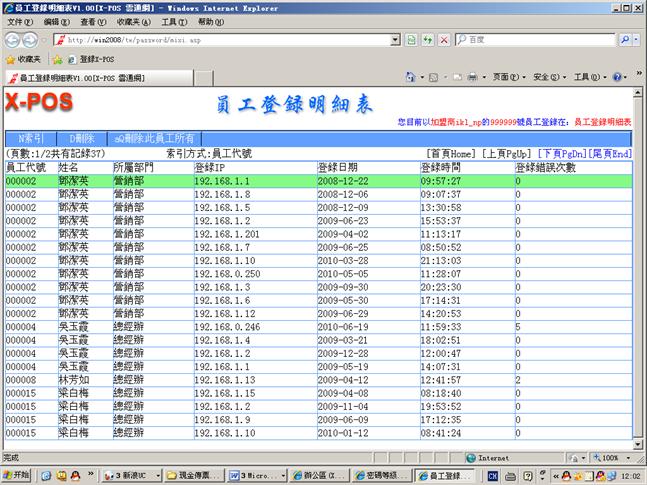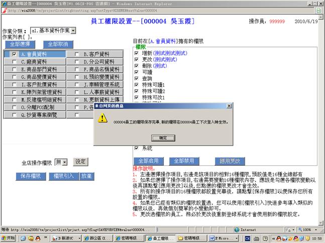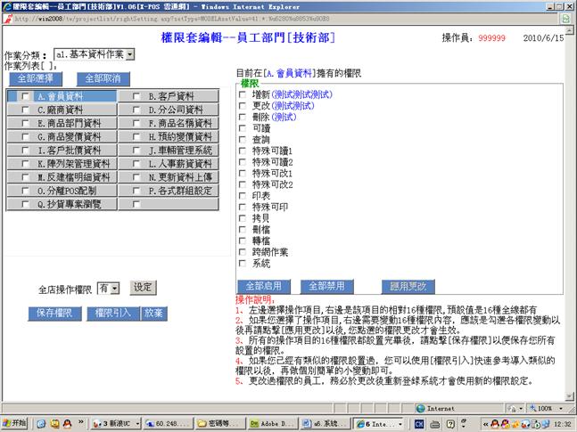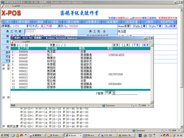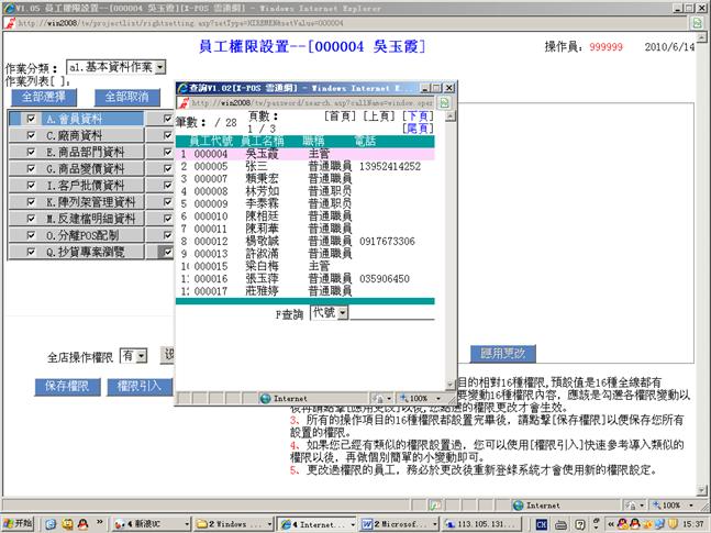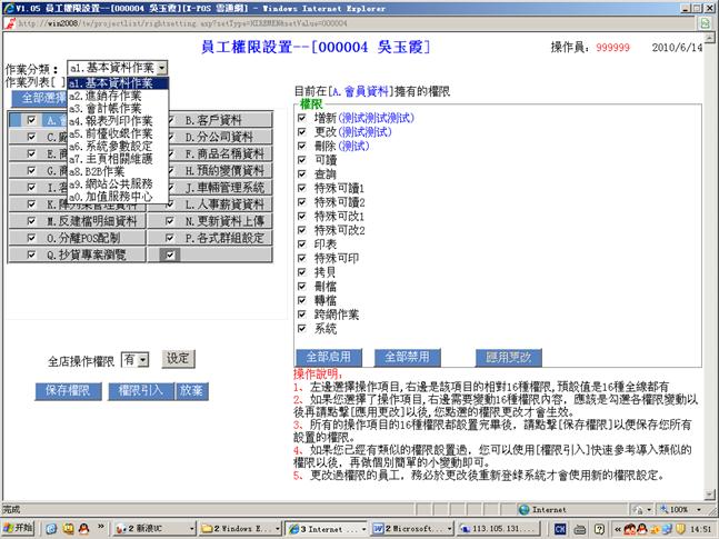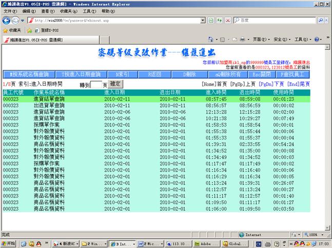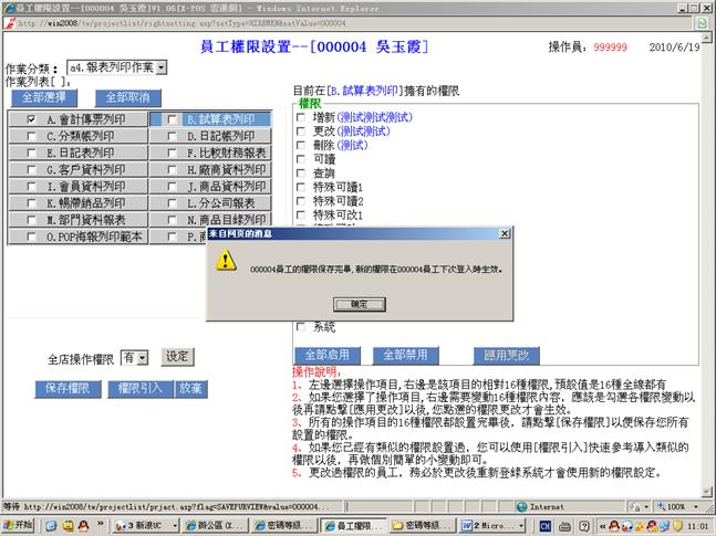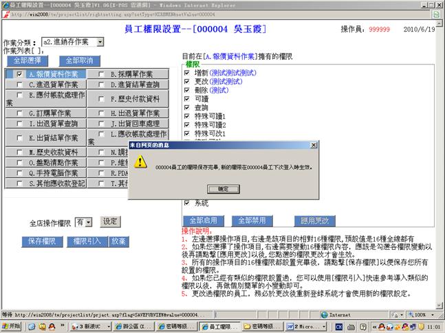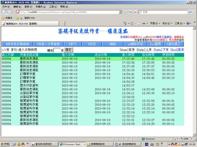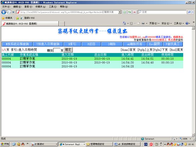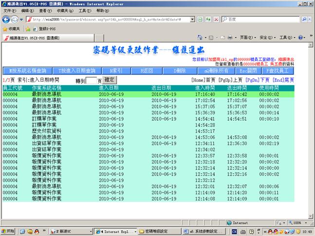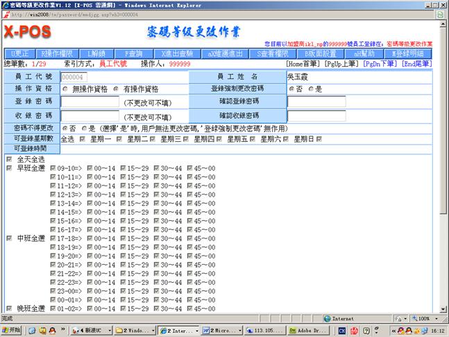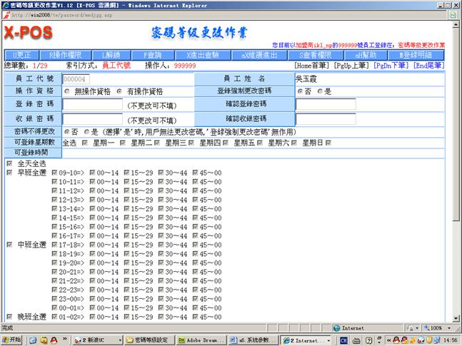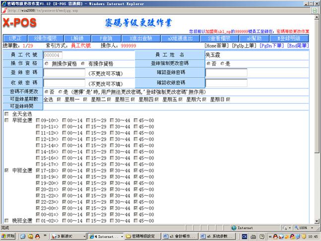 本作业首次登录可以由最高管理者员工代号999999进入操控,对于增加的每一位新员工都可以设定他的登录操作权限细项,以及限制他的登录有效时段,更能观察每位员工登陆作业时进出的状况,更能检查该员工密码是否被异常的破解登录,虽然系统设定有员工登录密码输入错误五次自动锁定三个小时,但是管理者还是应该利用本作业进去注意检验。