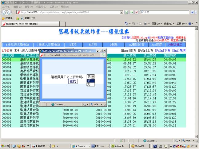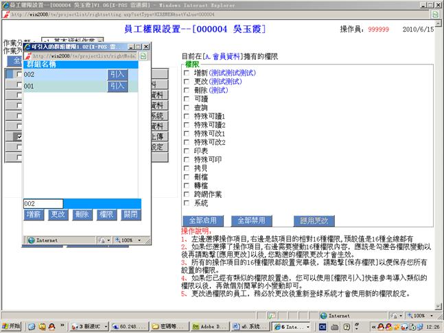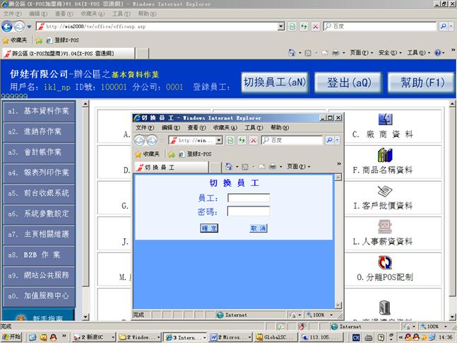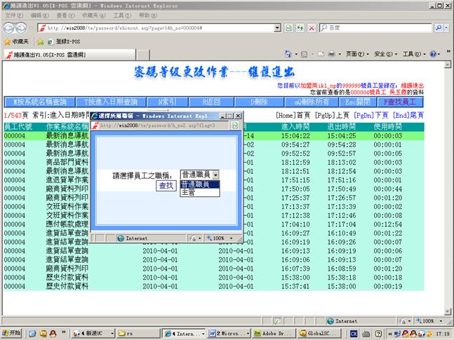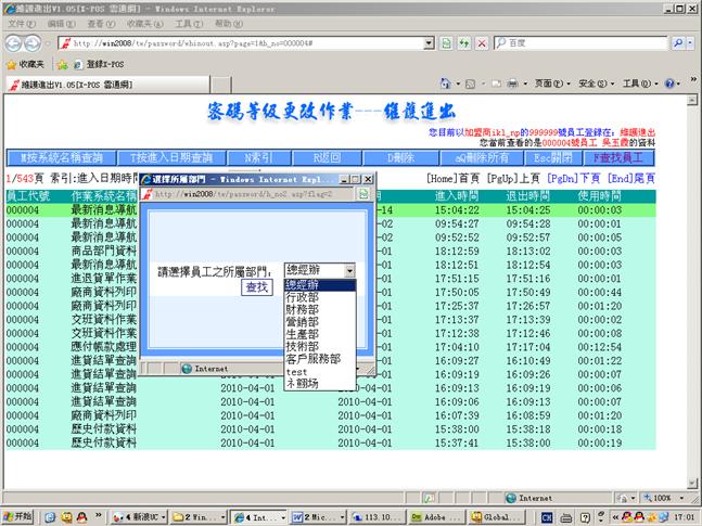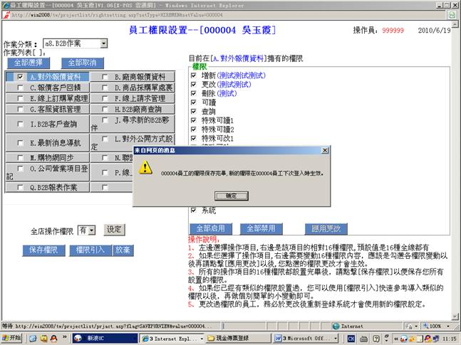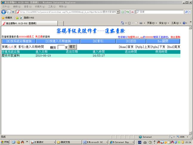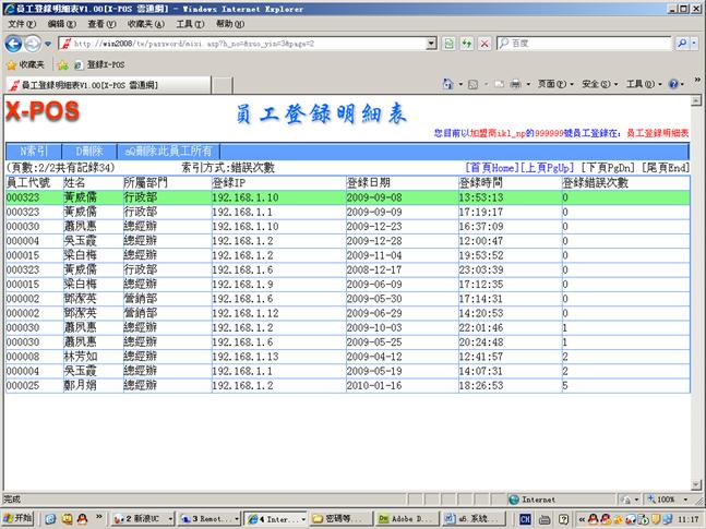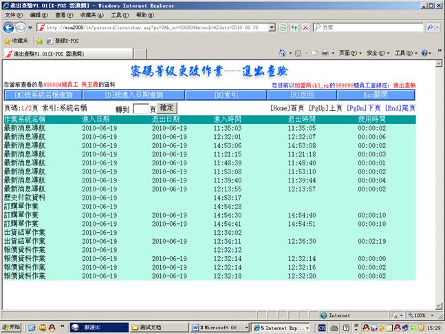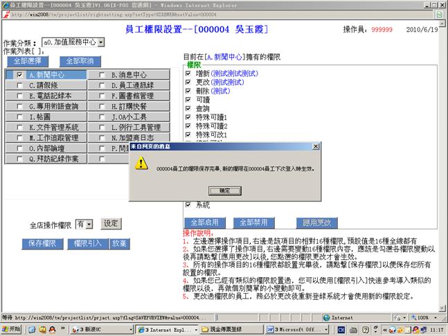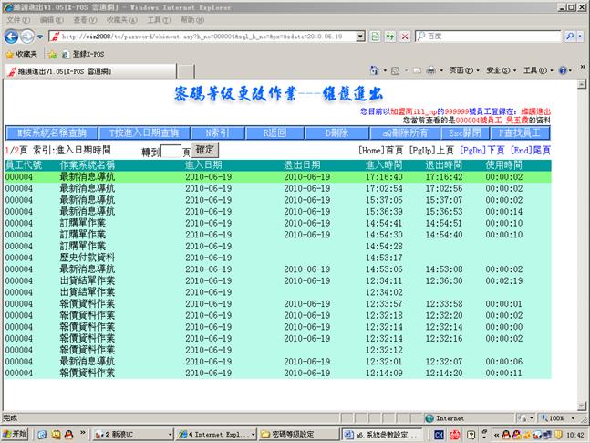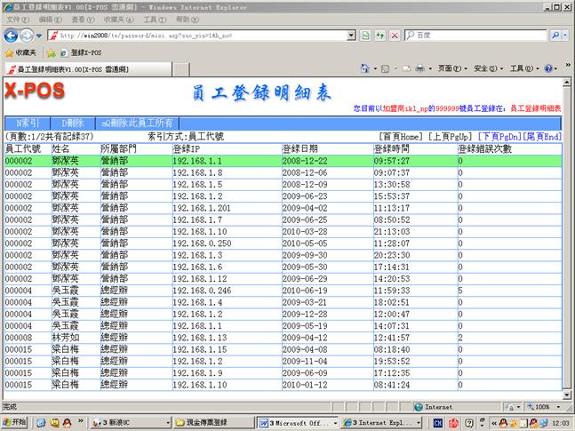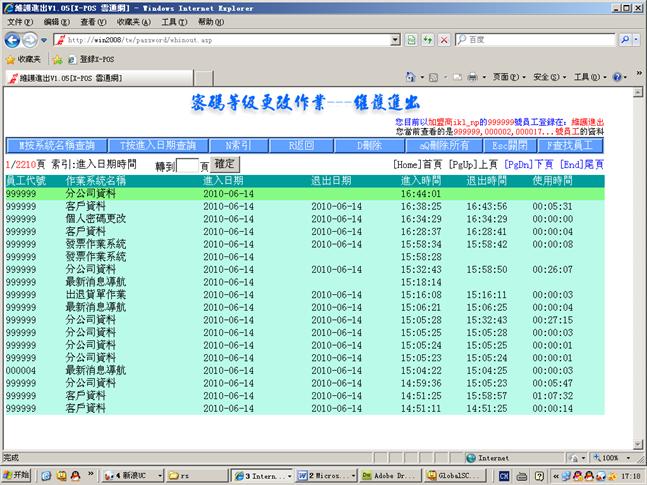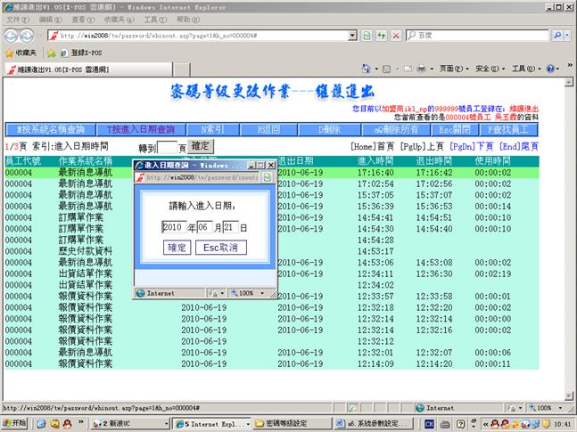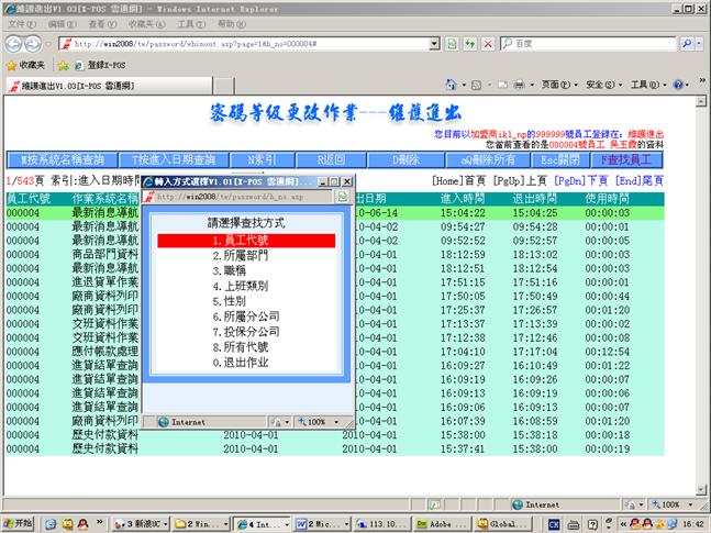 本作业首次登录可以由最高管理者员工代号999999进入操控,对于增加的每一位新员工都可以设定他的登录操作权限细项,以及限制他的登录有效时段,更能观察每位员工登陆作业时进出的状况,更能检查该员工密码是否被异常的破解登录,虽然系统设定有员工登录密码输入错误五次自动锁定三个小时,但是管理者还是应该利用本作业进去注意检验。