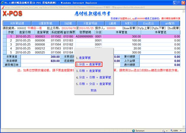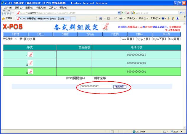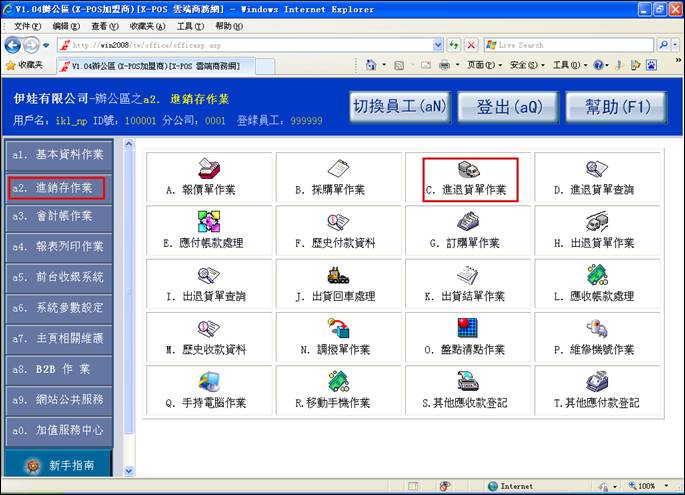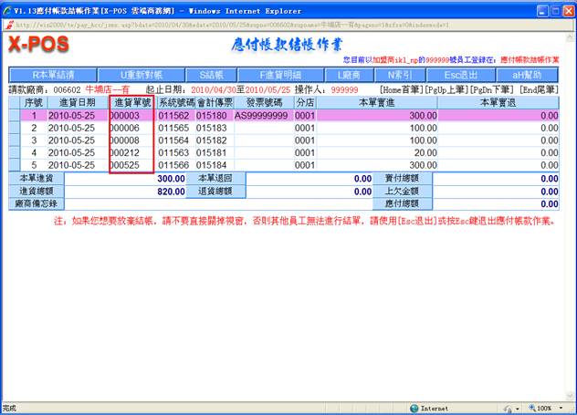 2-F 发票号码:针对该进货单内容的相对发票号码,本项可以连结到发票管理系统,也就是以发票号码可以连结查询到相对的进货资料内容,只是因为进货系统是配合印表纸张大小,采用的是11吋的连续报表纸中一刀(半张)的格式,所以进货资料只可以输入最多15笔的内容,万一厂商使用的电子发票是超过15笔的话,在本系统是必须分割为二张以上的进货单资料,因此可能导致不同的进货单内容但是却有相对一样的发票号码内容情况发生。前两位元为字母,后八位元为数字,如果输入不正确,就会弹出提示框,按