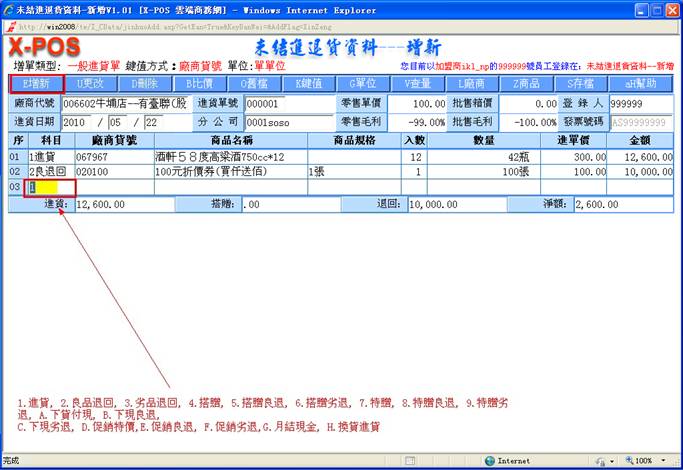 2-C 进货日期:实际的进货日期,其实系统已经给您默认进货日期为当天系统日期,如果您不需要更改,可以直接按键盘上的