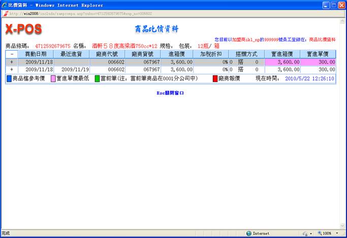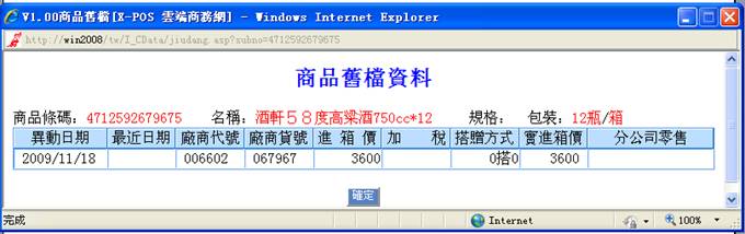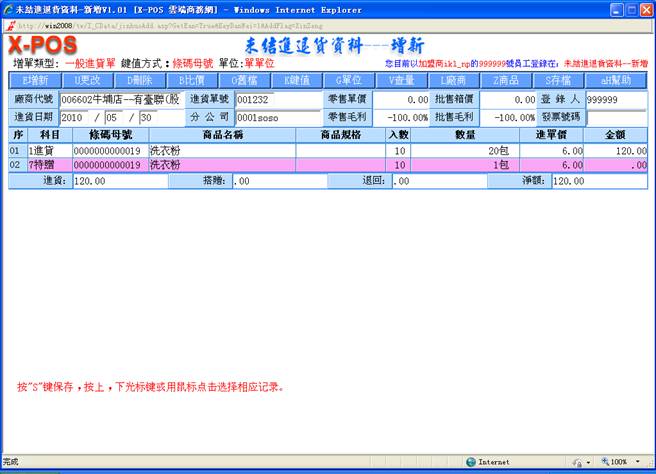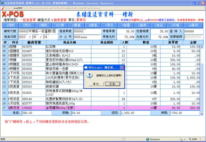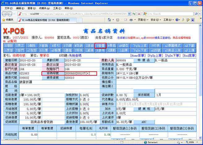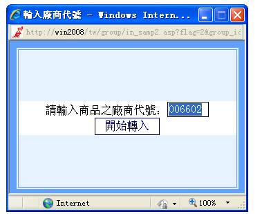 系统会去找出该商品母号相同条码的所有商品出来,再去比对其中是不是有本[厂商代号]的商品存在,存在的话就直接抓取该商品资料的相关内容转入进货作业中继续操作;但是万一一样的条码商品又建立有指定的厂商代号商品,可是该厂商代号的商品可能有一个以上时,系统并不会要求操作者选择使用哪一个厂商货号的商品,只是给于第一个找到的厂商代号的商品继续操作,因此有同样的条码商品又同一个厂商代号,但是必须建立二个不同厂商货号的商品资料这样的情况,那进货作业时就应该切换使用厂商货号的输入方式,直接指定输入该厂商货号商品即可。