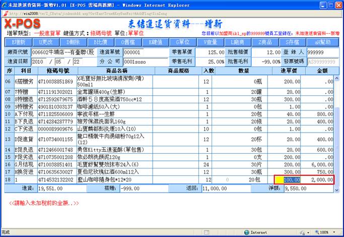 18-J>发票明细:有指定发票号码之进货单,将会将进货金额转入发票明细档中。但是执行本项财税同步功能时,一定需要进货金额与发票上的金额完全吻合。