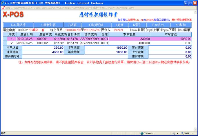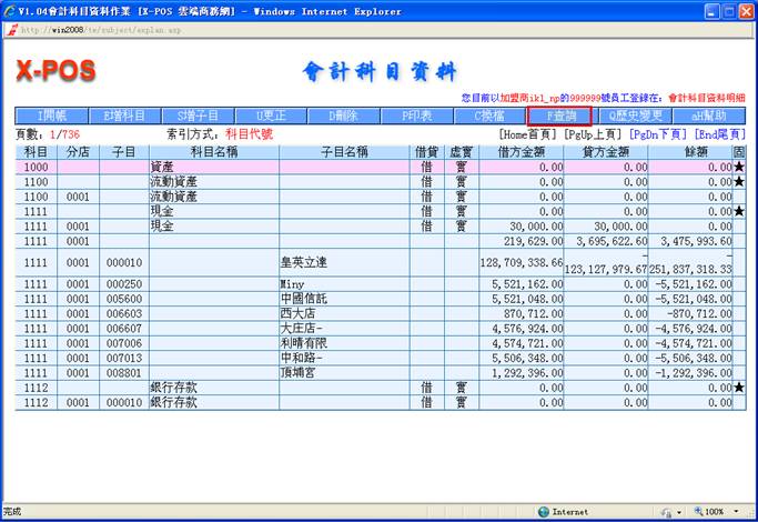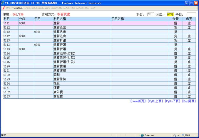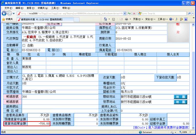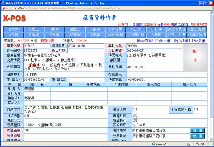 键后,若输入代号不足六位时,系统会在前面自动补零足6位,若您输入的厂商代号存在资料并且交易情况为[A.往来中]时,系统自动读取出与该厂商代号相对应之厂商名称: