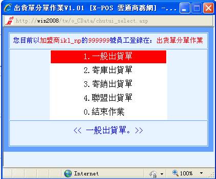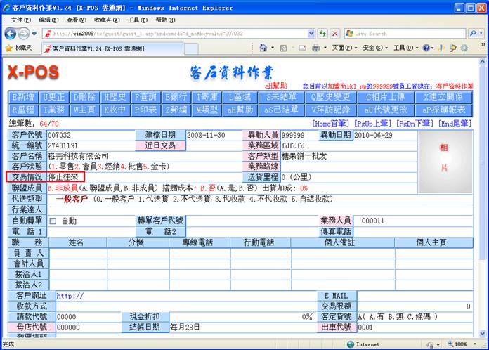 1-4.停止往来:客户资料中的交易情况设定为[X停止往来]者,选取出货客户要做采购作业时,系统将提出警告并禁止作业,这是因为如果已经有了出货单的存在,也就是有出货的事实,就必须先让操作者输入出货资料的考量。并且将停止所有报表列印功能。如果客户代号:007032,资料中交易情况:停止往来,那麼,在出货时系统将提出警告并禁止作业。