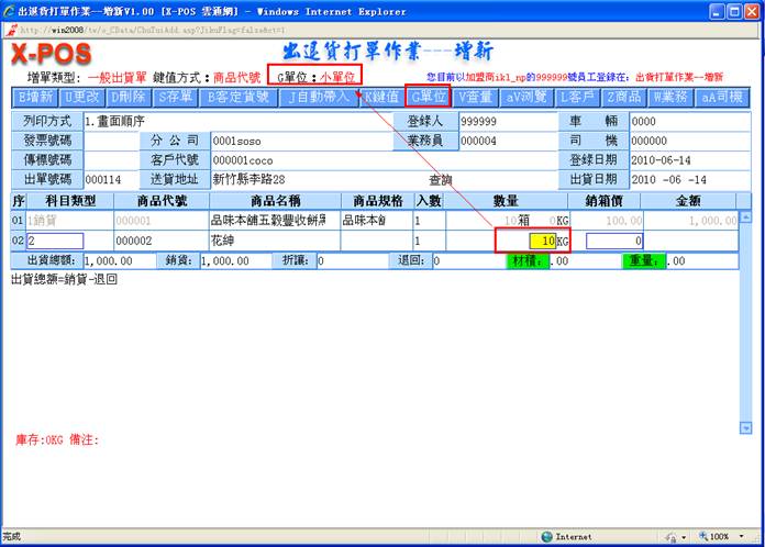 9-1. 系统允许作业中利用[G单位]快速切换键,来切换只显示小单位的总数量,或是显示大小单位自动换算的双单位显示模式,二种模式可以适合各式不同显示需求习惯的企业使用。