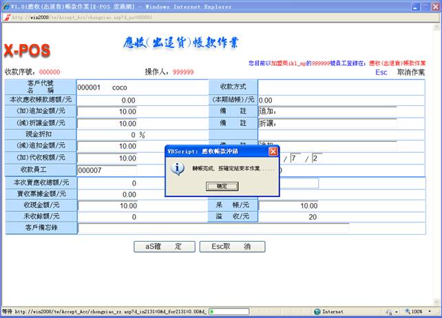 应收帐帐款冲销作业主要是进行会计冲销结算,转历史档。提供了二种收款方式:银行支票和现金二种, 方便用户进行选择。用户进行冲销时, 对于已月结的应收帐款, 也可以先冲销一部分或全部冲销。