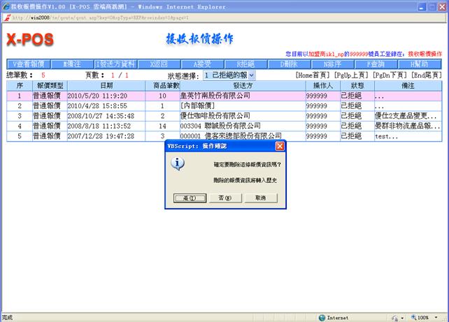 9-3.选择是,则报价信息将被删除转入历史档,如下图: