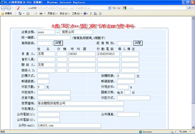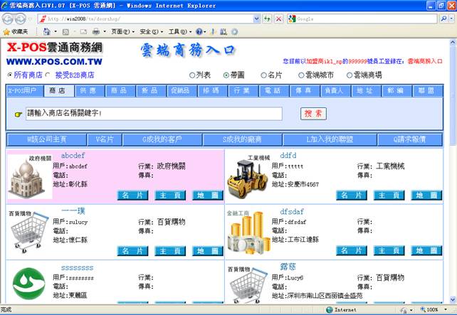 在左上角选择‘接受B2B商店’,再选择查询条件的类型,有“X-POS用户、商店、供应、商品、新品、促销品、条码、行业、电话、传真、负责任、地址、邮编、联盟”,然后输入关键字,点击搜索。在下面的商店列表中找到你想建立关係的商店。如下图: