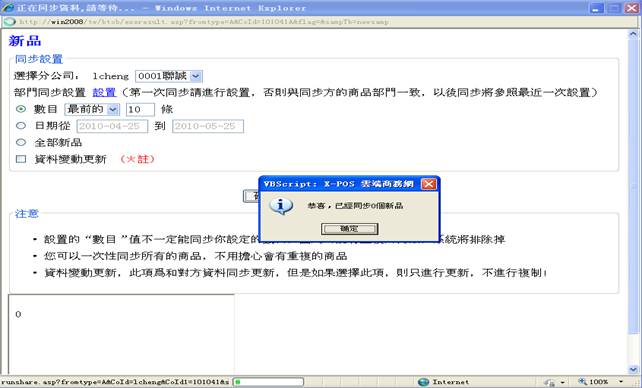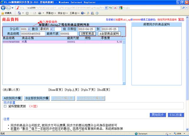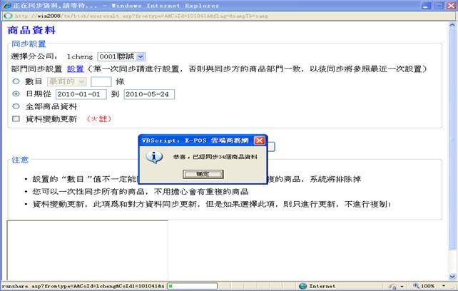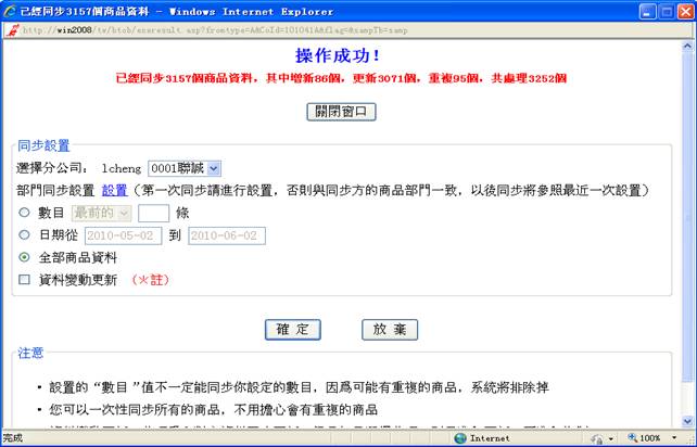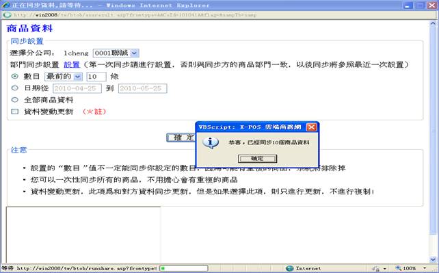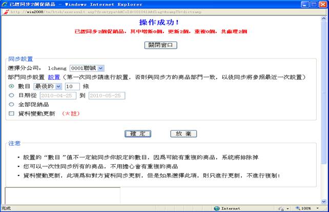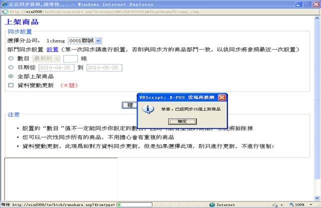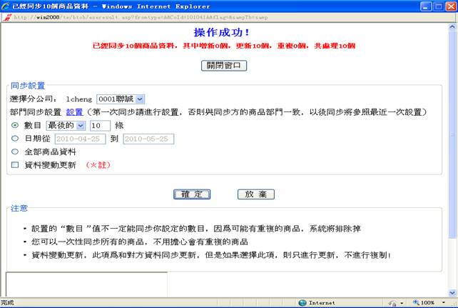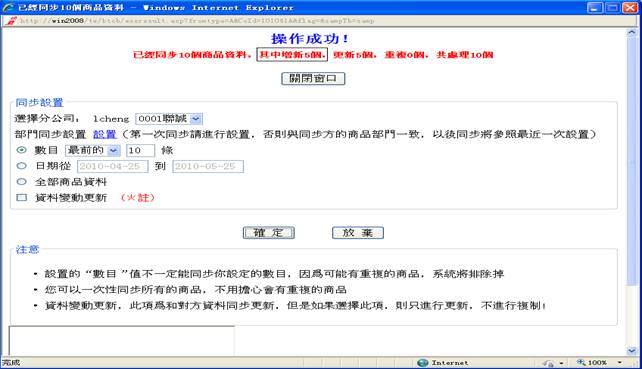 上图,选择分公司:您可以选择lcheng旗下的一所分公司;部门同步设置:数目,您可以选择同步最前的或最后的商品,再输入同步指定商品的条数;日期,您可以选择同步某段日期期间内的商品;全部商品资料,同步所有商品资料。(更多信息看页面的注意事项)