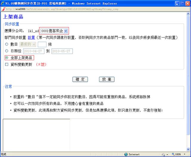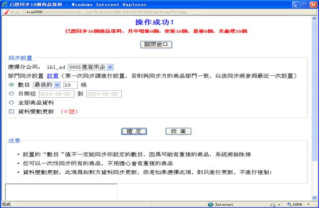 上图,选择分公司:您可以选择ikl_xd旗下的一所分公司;部门同步设置:数目,您可以选择同步最前的或最后的商品,再输入同步指定商品的条数;日期,您可以选择同步某段日期期间内的商品;全部商品资料,同步所有商品资料。(更多信息看页面的注意事项)