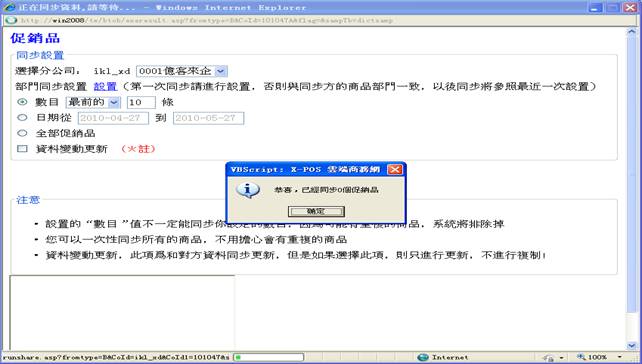 上图,选择分公司:您可以选择ikl_xd旗下的一所分公司;部门同步设置:数目,您可以选择同步最前的或最后的商品,再输入同步指定商品的条数;日期,您可以选择同步某段日期期间内的商品;全部促销商品,同步所有促销商品。(更多信息看页面的注意事项)