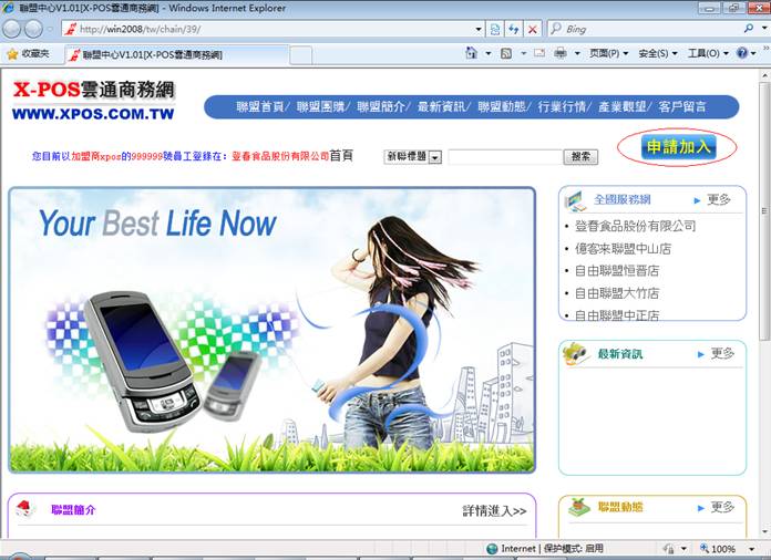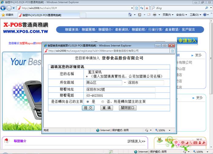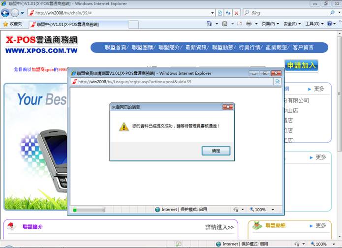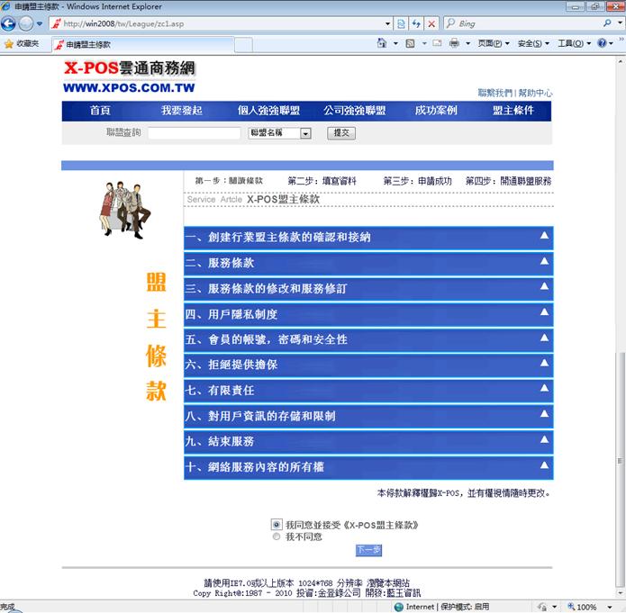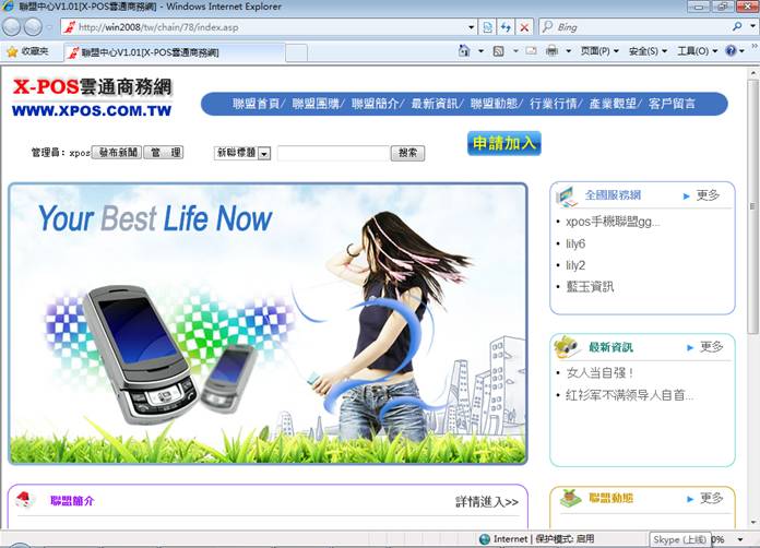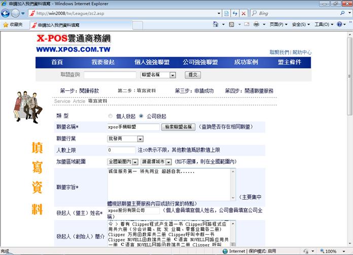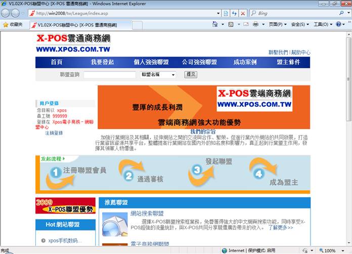 X-POS联盟中心就是X-POS网络平台系统,为让弱势的小企业可以透过加盟的方式,让自己的同业或是异业作结合,产生更大的营销组织效益,增加营销的范围与服务对象。就好像是一家小花店可以结合全国一样的小花店,变成全国性的服务网,这样才可以争取到更多的客户群。一家小小的餐厅也可以结合相同菜色的餐厅,联盟成为一个全市或全省的外卖服务网呢!一个小手机批发商也可以利用联盟中心,建构出全国性的销售与维修服务网呢!只要有野心的企业都可以利用联盟中心扩大自己的营销领域的。
