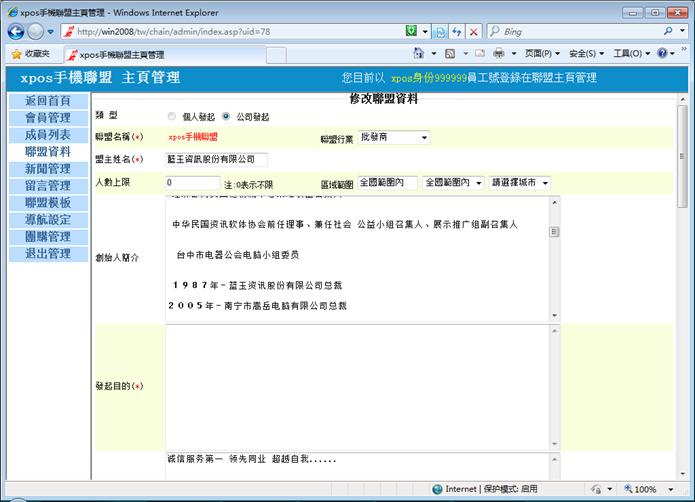 进行修改。例如我把盟主姓名“xpos股份有限公司”改为“蓝玉云科技股份有限公司”。