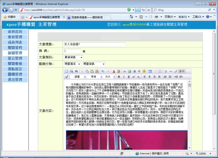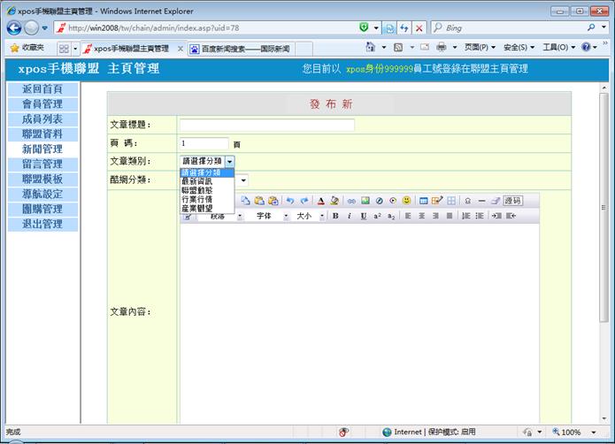 注意:添加新闻==>文章类别如果选择“最新资讯”则在联盟中心的“最新资讯”中显示,选择“联盟动态”则在联盟中心的“联盟动态”显示,选择“行业行情”则在联盟中心的“行业行情”显示,选择“产业观望”则在联盟中心的“产业观望”中显示,添加方法都是一样的,这裡就不多说了。