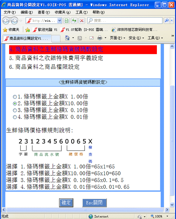 按鈕確定輸入,用戶可仔細查看裡面的說明(選擇1:條碼標簽上的金額*1倍、選擇2:條碼標簽上的金額*10倍、選擇3:條碼標簽上的金額*0.1倍和選擇4:條碼標簽上的金額*0.01倍,在此需要注意的是,此類設定需重新啟動X-POS頁面才能更方便您使用):