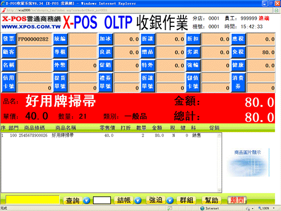 6-9、輸入以上數據后,X-POS收銀界面將顯示此商品的信息(商品名稱為好用牌掃帚,2把總金額為80元)。