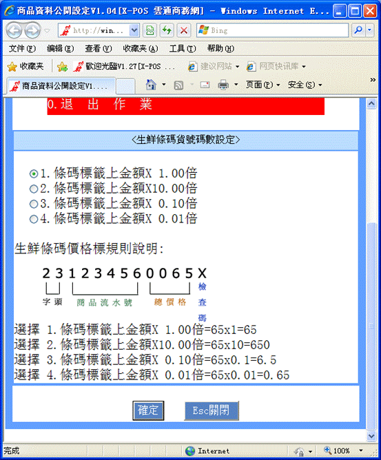 7-14、接下來演示的是運用4.條碼標籤上金額X0.01倍購買此商品(單價為5元的白糖)。按以上操作步驟,商品資料公開設定頁面中溝選