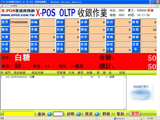 7-13、以下是完成上步操作后X-POS收銀界面,此時可見單價為5元的白糖在設定為條碼標籤上金額X0.10倍的情況下,購買100kg的總金額為50元(500元*0.10倍)。該商品條碼母號為2698765400500(紅色50表示此商品的價格)