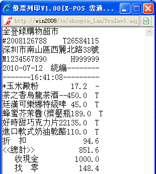 以上對話框顯示總計金額851.6元、收現1000元和找零148.4元;發票列印中顯示整單被折扣了94.6元、折后總計金額851.6元、收現金1000元以及找零148.4元等。此次結帳整單折扣操作成功!