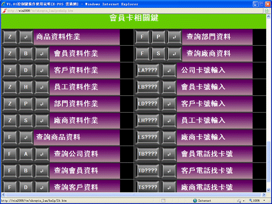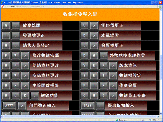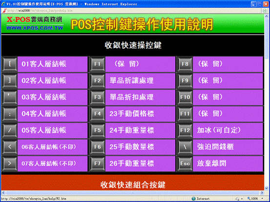 17-2、彈出以下POS控制鍵操作使用說明頁面,此頁面分4類快捷鍵操作使用說明,移動頁面中的滾動條可分別看到收銀快速操控鍵、收銀快速組合按鍵、收銀指令輸入鍵和會員卡相關鍵,移動頁面的滾動條即可查看更多的幫助信息。如點擊第一類(收銀快速操控鍵)的