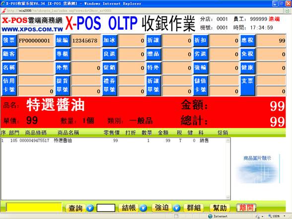 除了傳統的現金支付,X-POS收銀系統同樣支持信用卡等非現金支付。顧客使用信用卡付款系統可以記住是何人購買此商品並能自行記錄信用卡的卡號,同時也為顧客提供了結賬的方便。現以售價為99元的特選醬油為例用信用卡在01客人層結帳為例。操作方法如下: