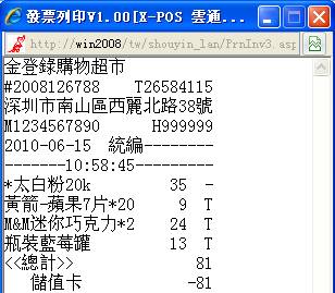 以上對話框所顯示:總計金額81元、應收0元、收現0元;發票列印顯示:儲值卡支付81元。儲值卡結帳操作完成!