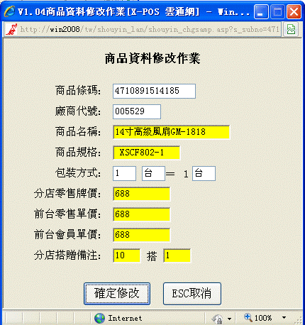 此功能可對商品資料進行修改,如改變商品的名稱、價格、及是否搭贈等。