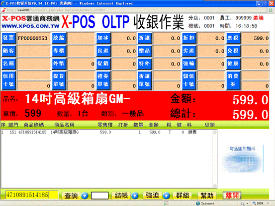 10-5、在原來的X-POS收銀界面中再次添加此商品(輸入框內輸入該商品的條碼母號並按