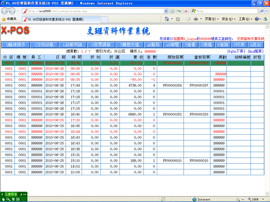 14-3、此時以下交班資料界面中的第一行記錄已為變紅顏色(如在X-POS收銀界面中正常離開,交班記錄將是正常顏色),並且已不再顯示“連線”。