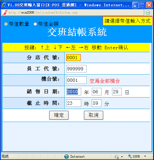 結帳為例,在輸入框裡輸入需要結帳的分店代號、員工代號、機臺號、銷售日期以及截止時間(其分店代號、銷售日期和截止時間為默認當前收銀機所使用資訊),並按