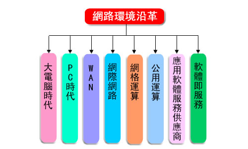4.网际网路(World Wide Web全球资讯网):也就是网际网路INTERNET的兴起,INTERNET可以说是改变人类生活生态环境的最大功臣,透过网际网路的无远弗届特性,可以很方便的与全世界数千万部的PC电脑结合,并且可以利用远端的强大电脑主机,只要本地的电脑下个执行指令,就可以得到快速无比的无限服务,最早期的也就是透过浏览器对远端的做网页内容的搜寻、浏览,这时的远端主机资料库管理,又往回走到大电脑的集中式管理模式,所不同的祇是以前是利用终端机演进为使用PC登录,可是运算工作还是集中在主电脑上,PC并无运算能力。透过网际网路环境的越来越成熟,也开始有更多功能的网路服务,以及改变电脑运算的环境能力,像是网格运算(Grid Computing)、公用运算(Utility Computing)、应用软体服务供应商ASP(Application Service Provider)、软体即服务SaaS(Software as a Service)、云端运算(Cloud Computing)