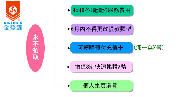 1.優先抵扣X-POS的各項網絡服務費用(此類可加值3%抵扣). 2.選擇此類服務者,自選擇日起6個月內不得中途變更提款類型. 3.只要額滿一萬X幣以上部份皆可以轉購X-POS預付充值卡. 4.我們建議您最好在半年內選擇永不領取。因爲您要是沒有把握半年內賺取足夠的X幣,可以利用增值3%的優勢,更快速累積您的X幣. 5.我們建議您應該多去使用X幣只要使用在浏覽別人的個人主頁與對方交流,當然剛開始您會覺得不劃算,因爲您每次收藏別人的個人主頁一次,您必須花掉一個X幣,可是相對的沒有付出是沒有收獲的。如果您精心設計您的個人主頁,相對地別人也會將您的個人主頁收藏起來,您也會賺回來您的X幣的. |