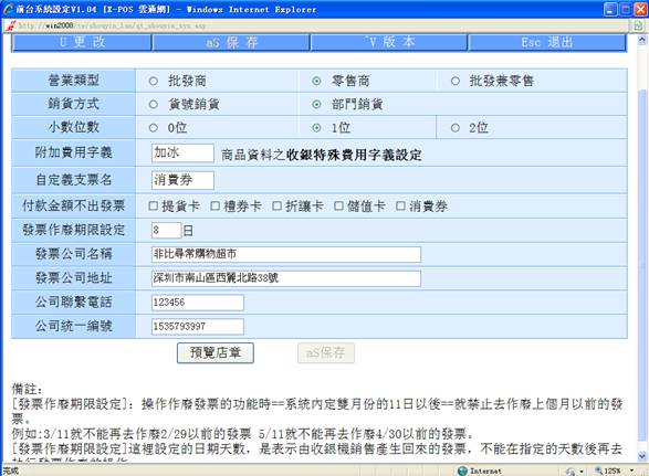 ),用戶可根據需求對其資料更改。如將營業類型設定為“零售商”、銷貨方式設定為“部門銷貨”、小數位數設定為“0位”、附加費用字義設定為“加冰”、自定義支票名定為“消費券”、發票作廢日期設定為“5日”、發票公司名稱設定為“藍玉購物超市”、發票公司地址設定為“深圳市南山區西麗北路38號”、公司聯系電話設定為“