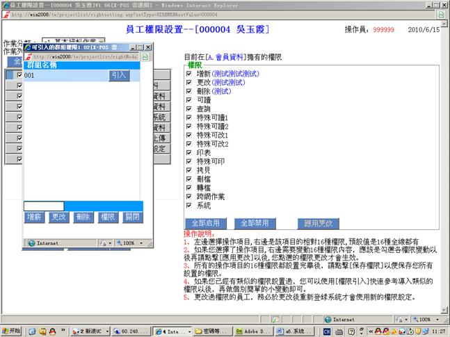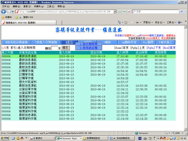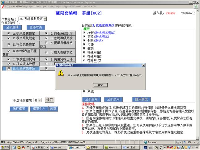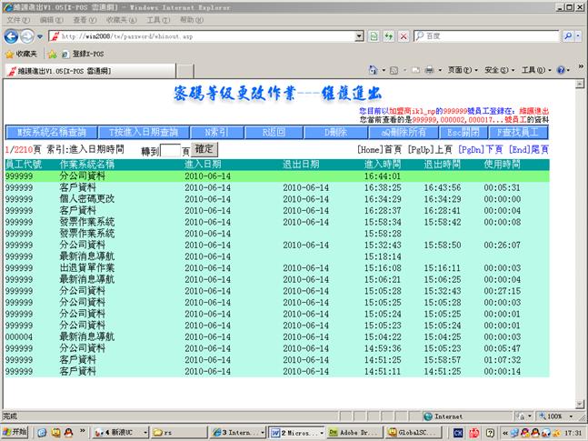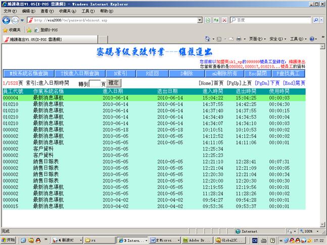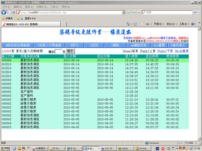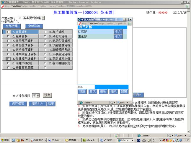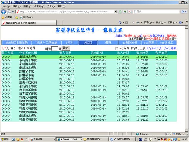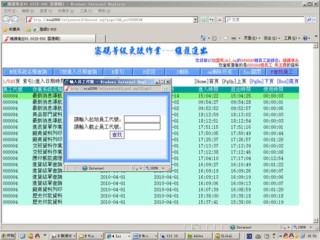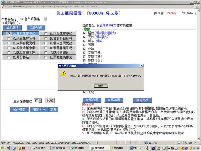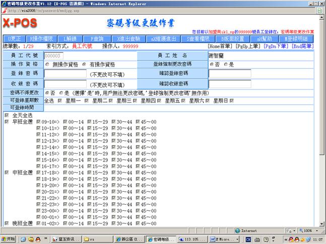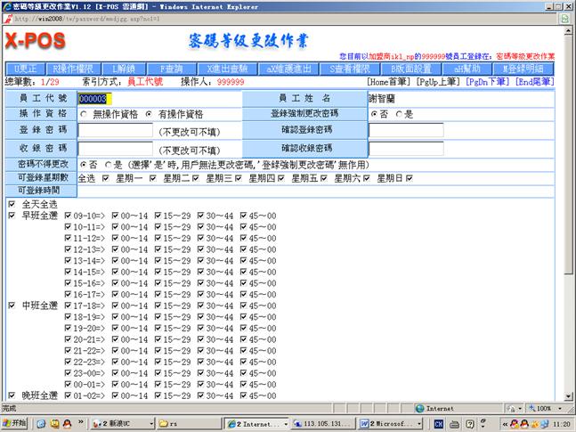 本作業首次登錄可以由最高管理者員工代號999999進入操控,對於增加的每一位新員工都可以設定他的登錄操作權限細項,以及限制他的登錄有效時段,更能觀察每位員工登陸作業時進出的狀況,更能檢查該員工密碼是否被異常的破解登錄,雖然系統設定有員工登錄密碼輸入錯誤五次自動鎖定三個小時,但是管理者還是應該利用本作業進去注意檢驗。