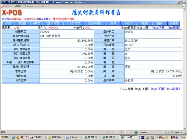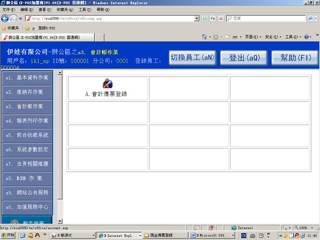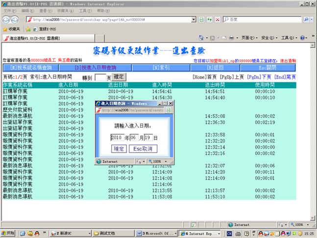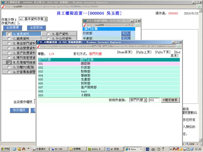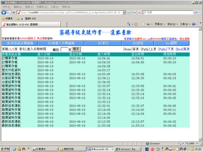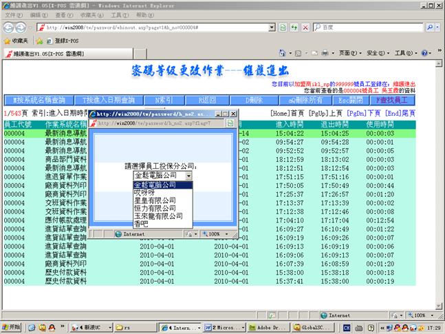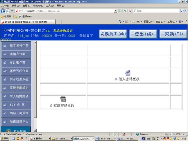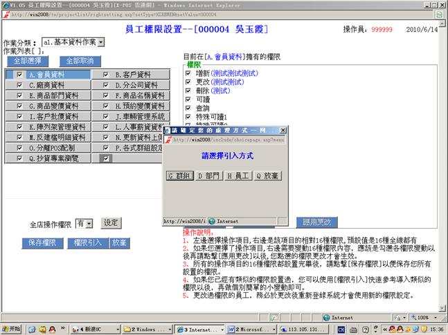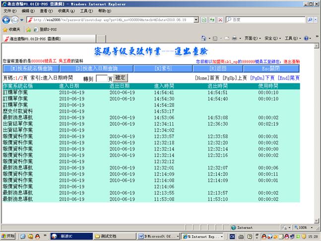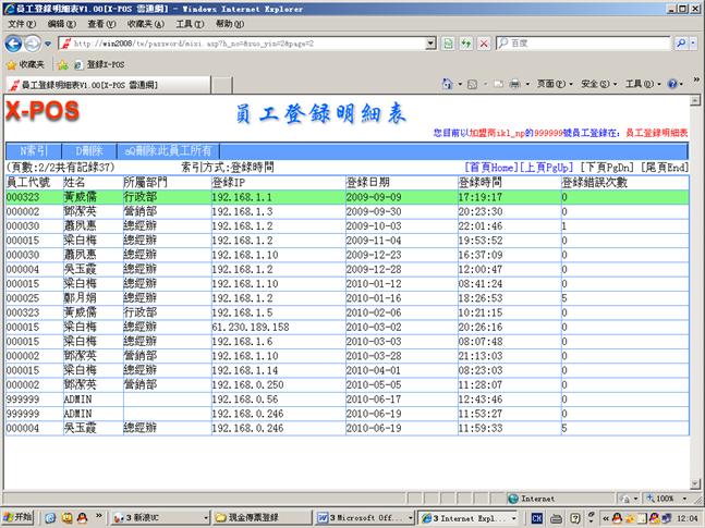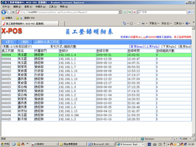 本作業首次登錄可以由最高管理者員工代號999999進入操控,對於增加的每一位新員工都可以設定他的登錄操作權限細項,以及限制他的登錄有效時段,更能觀察每位員工登陸作業時進出的狀況,更能檢查該員工密碼是否被異常的破解登錄,雖然系統設定有員工登錄密碼輸入錯誤五次自動鎖定三個小時,但是管理者還是應該利用本作業進去注意檢驗。