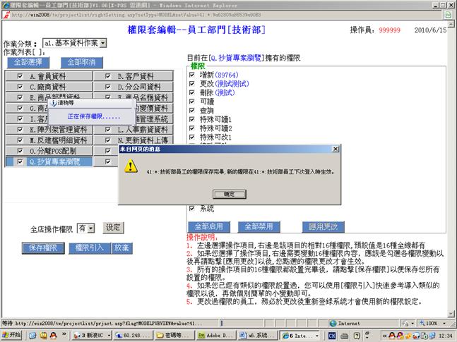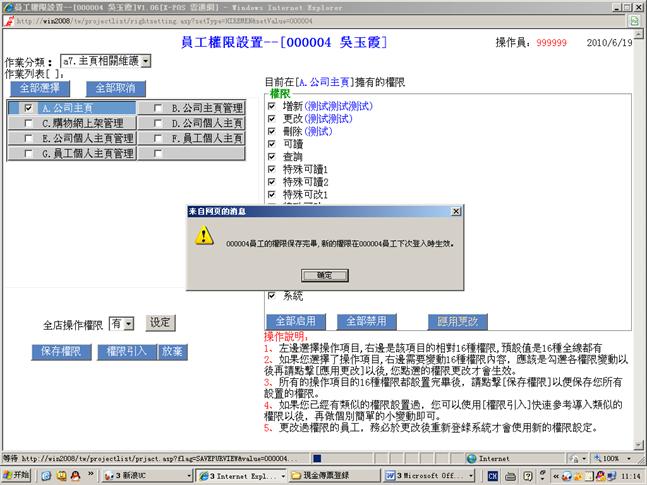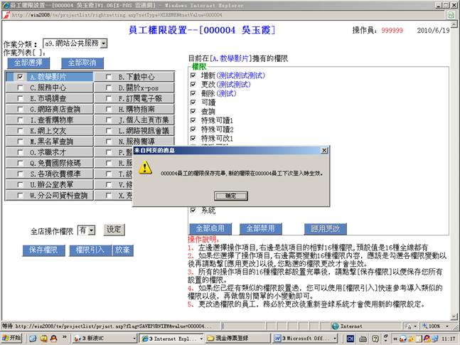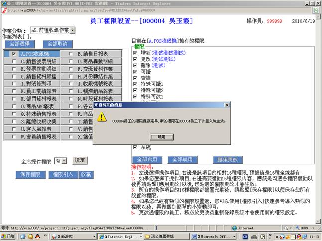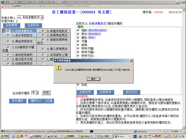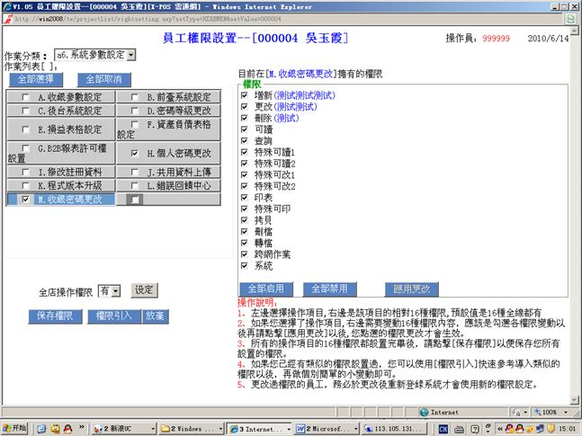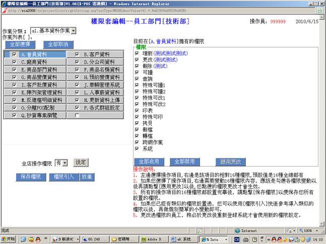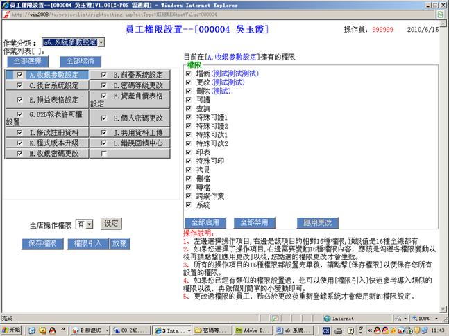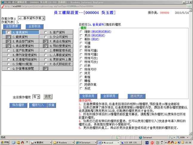 4-1. 在作業分類中選擇要更改的選項=》作業列表中選擇員工相應的權限;全店操作權限設為“有”=》點擊