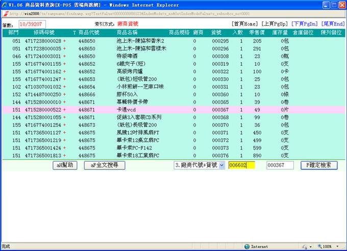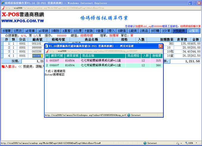 3-8.系統會去找出該商品母號相同條碼的所有商品出來,再去比對其中是不是有本[廠商代號]的商品存在,存在的話就直接抓取該商品資料的相關內容轉入進貨作業中繼續操作;但是萬一一樣的條碼商品又建立有指定的廠商代號商品,可是該廠商代號的商品可能有一個以上時,系統並不會要求操作者選擇使用哪一個廠商貨號的商品,只是給於第一個找到的廠商代號的商品繼續操作,因此有同樣的條碼商品又同一個廠商代號,但是必須建立二個不同廠商貨號的商品資料這樣的情況,那進貨作業時就應該切換使用廠商貨號的輸入方式,直接指定輸入該廠商貨號商品即可。