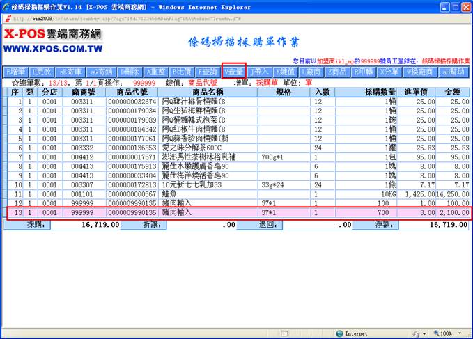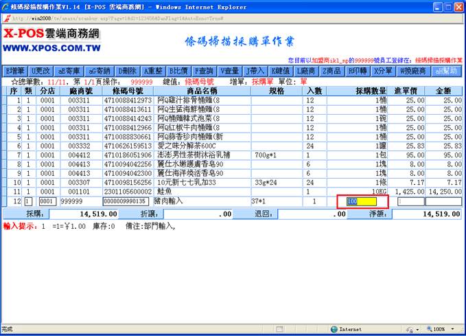 前面輸入了條碼母號或廠商貨號,系統會自動把資訊填入相應的地方裡面,本項商品的進貨金額小計將自動顯示;你若覺得不妥,可以修改金額: