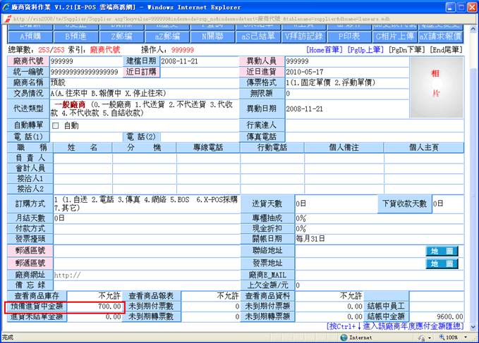 3-17.未增加條碼掃描採購單作業前,廠商資料的預備進貨中金額為:700.00;