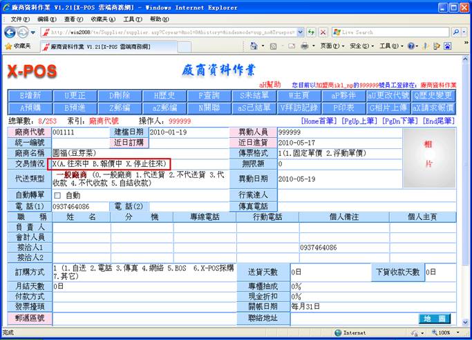 若該廠商代號不存在,或該廠商資料中的交易情況設定為[X停止往來]時,如輸入:001111的廠商代號時,交易情況為=X,表示本廠商已經停止往來。