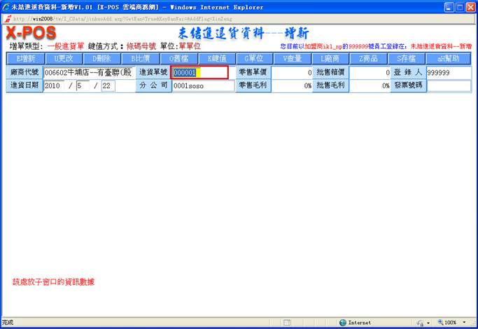 2-B 進貨單號:可以輸入廠商的出貨單號碼內容,如此方便廠商的出貨單內容與自己方的進貨單內容近似,當萬一單據內容有問題需要以廠商的出貨單找尋自己方進貨單時,雙方可以更容易溝通找尋出來。輸入的進貨單號為6位數字,若不足6位數字時前面將自動補零,同一家廠商代號的進貨單號不能重複,若有重複輸入,則會彈出警告: