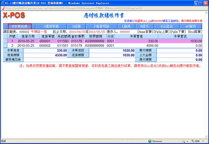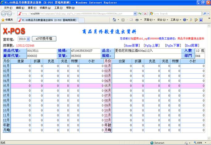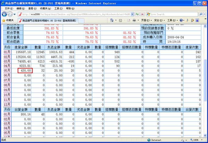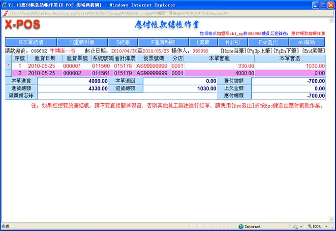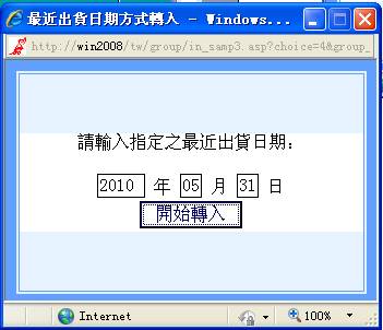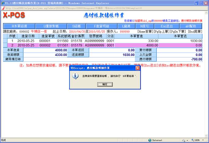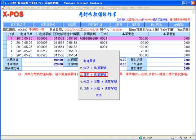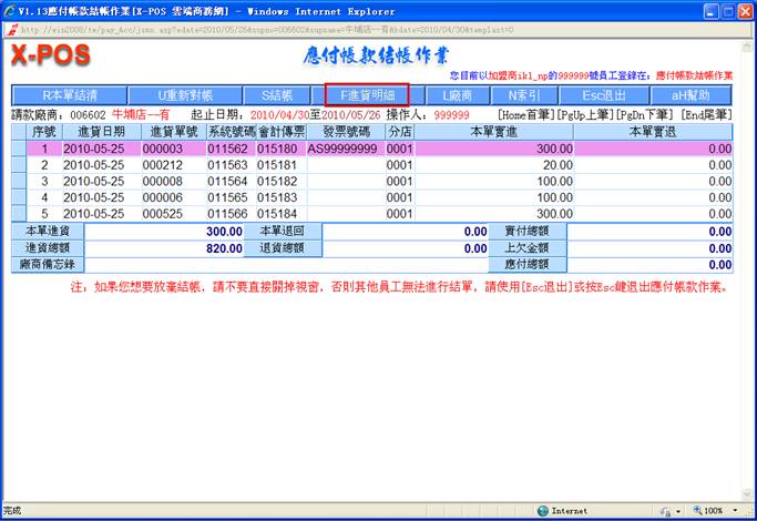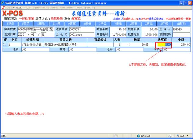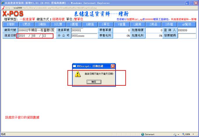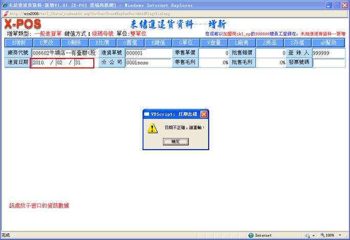 對指定的進貨日期做進貨單明細列表時,可以知道當天的實際進貨總額。正確日期格式為(如:2010/05/15 或 2010/5/15),如果輸入的格式不正確即彈出警告之提示;