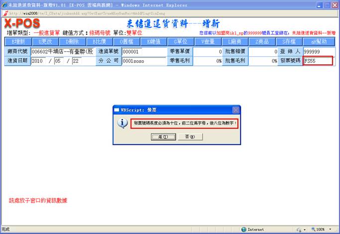 2-F 發票號碼:針對該進貨單內容的相對發票號碼,本項可以連結到發票管理系統,也就是以發票號碼可以連結查詢到相對的進貨資料內容,只是因為進貨系統是配合印表紙張大小,採用的是11吋的連續報表紙中一刀(半張)的格式,所以進貨資料只可以輸入最多15筆的內容,萬一廠商使用的電子發票是超過15筆的話,在本系統是必須分割為二張以上的進貨單資料,因此可能導致不同的進貨單內容但是卻有相對一樣的發票號碼內容情況發生。前兩位元爲字母,後八位元爲數字,如果輸入不正確,就會彈出提示框,按