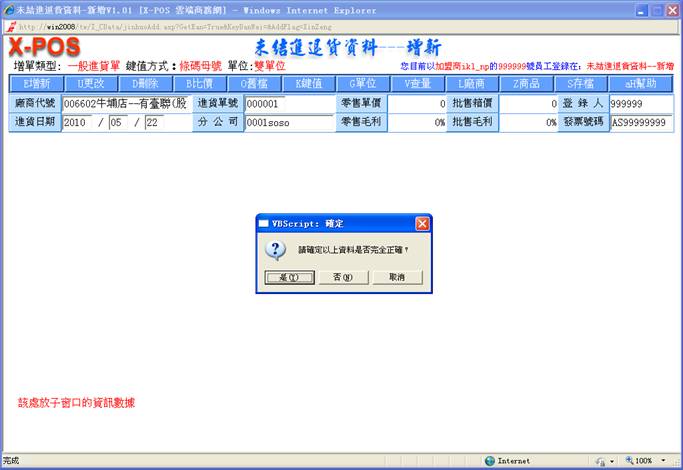 進貨單所屬廠商的基本資料輸完後,彈出提示;單擊