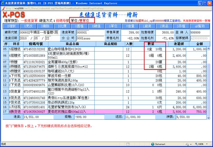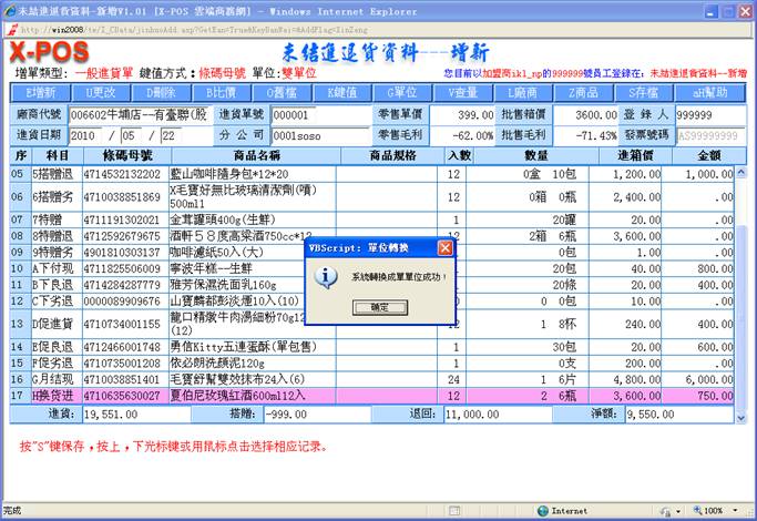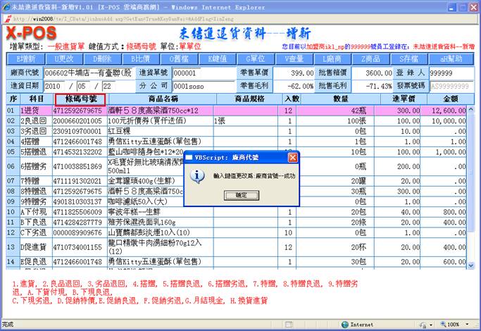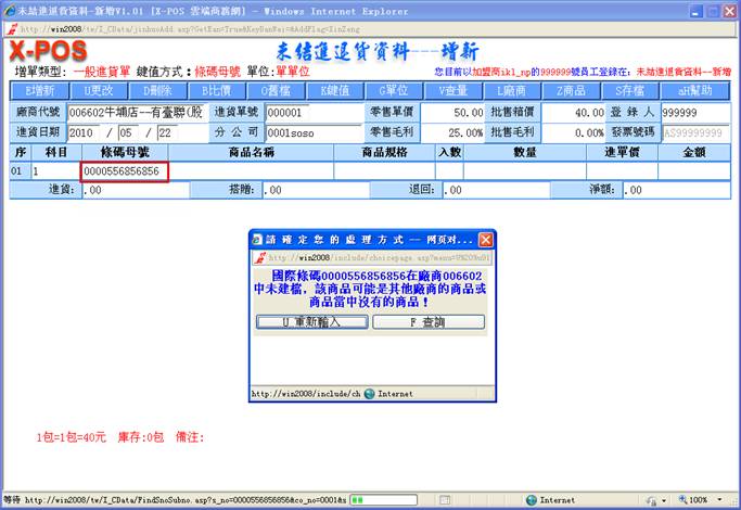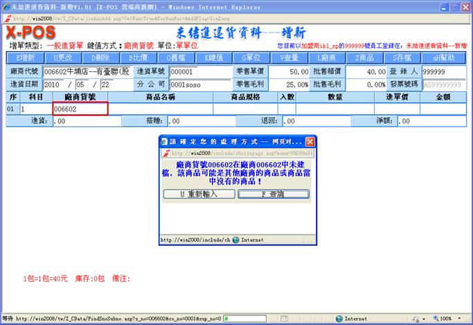 系統會去找出該商品母號相同條碼的所有商品出來,再去比對其中是不是有本[廠商代號]的商品存在,存在的話就直接抓取該商品資料的相關內容轉入進貨作業中繼續操作;但是萬一一樣的條碼商品又建立有指定的廠商代號商品,可是該廠商代號的商品可能有一個以上時,系統並不會要求操作者選擇使用哪一個廠商貨號的商品,只是給於第一個找到的廠商代號的商品繼續操作,因此有同樣的條碼商品又同一個廠商代號,但是必須建立二個不同廠商貨號的商品資料這樣的情況,那進貨作業時就應該切換使用廠商貨號的輸入方式,直接指定輸入該廠商貨號商品即可。