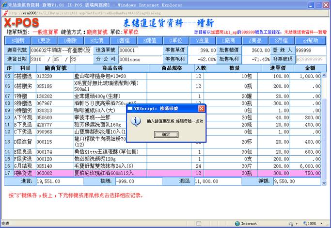 的幫助。此輸入方式利用條碼掃描器作硬體掃描取得條碼母號,可保證輸入快捷並不發生人為輸入代號錯誤的情況,一般都是使用在超市零售業的進貨,或是五金、文具、飾品等等在包裝上已經大量使用條碼的商品業者最是好用。具體操作方法如下: